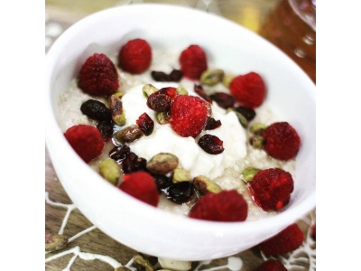 1 cana mica de fulgi de ovaz se amesteca cu 1 lingura de merisoare peste care se toarna 2 cani mici de apa clocotita (1 cana fulgi ovaz:2 cani de apa) si se amesteca pana cand compozitia va deveni de consistenta unei budinci (se lasa putin la racit), iar deasupra adaugam cele 2 linguri de iaurt amestecat cu putina miere, 1 lingura de fistic (sau chiar putin unt de arahide/ migdale), cealalta lingura de merisoare si asezam zmeura.